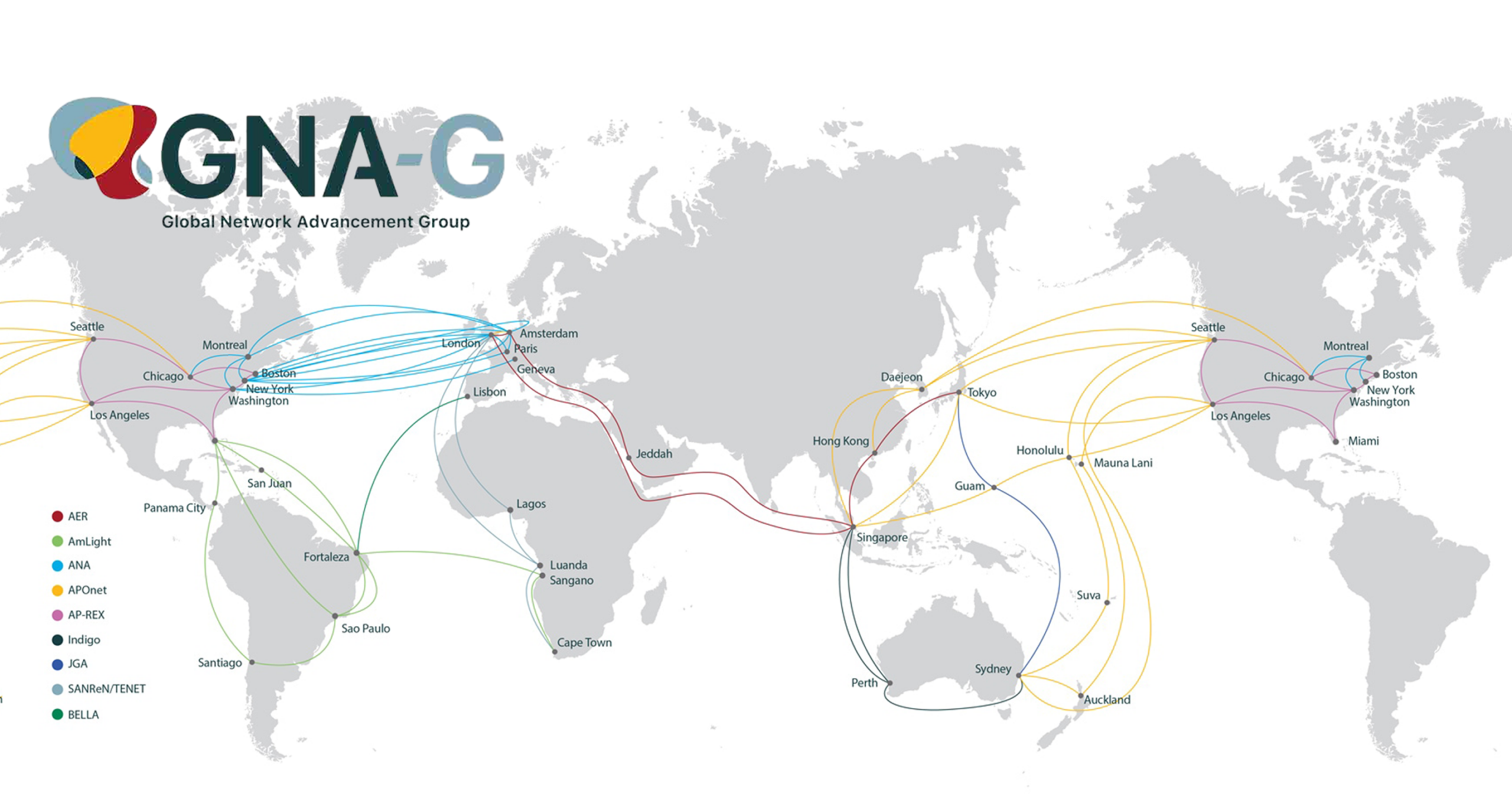A joint global effort was needed to coordinate the establishment of intercontinental connections, and this gave birth to Global Network Architecture (GNA), later on merged with the Global Lambda Integrated Facility (GLIF) into Global Network Advancement Group (GNA-G).